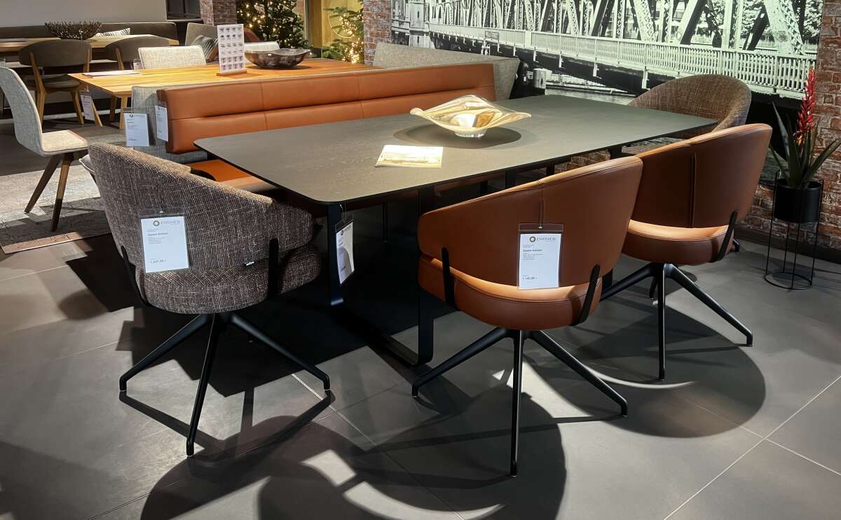 Platte Eiche schwarz geflammt, mit Schweizer Kante, Kufengestell Metall schwarz matt