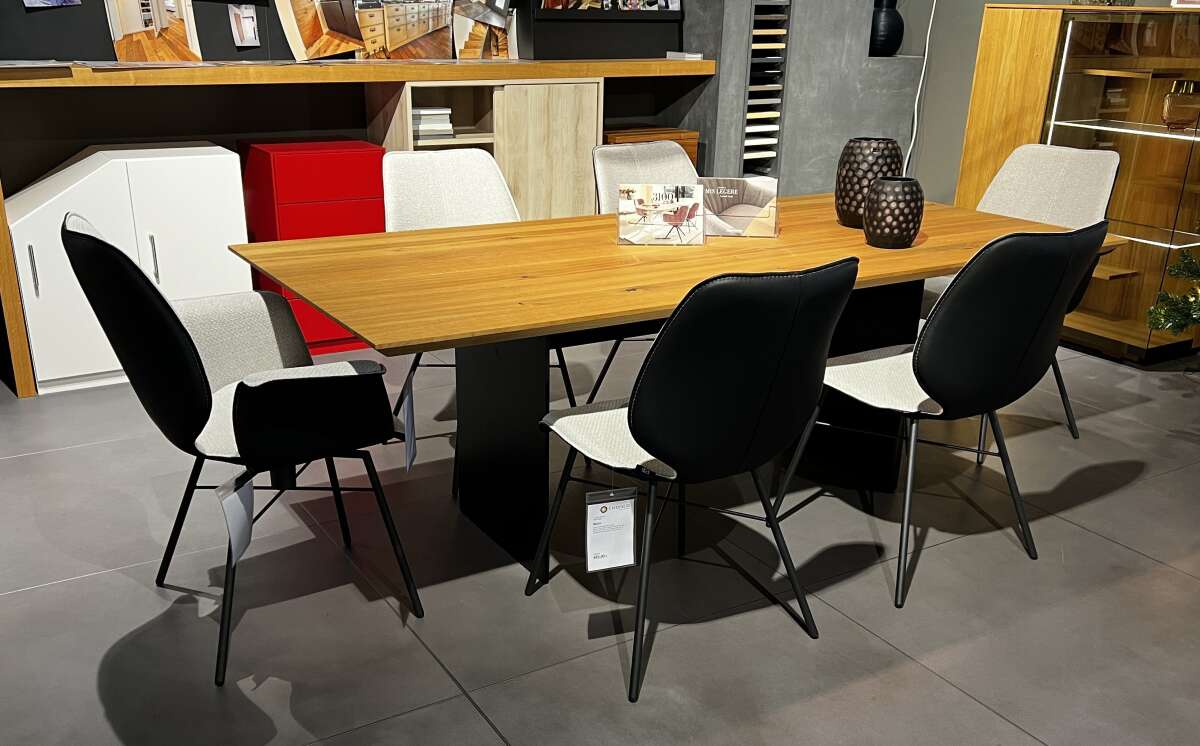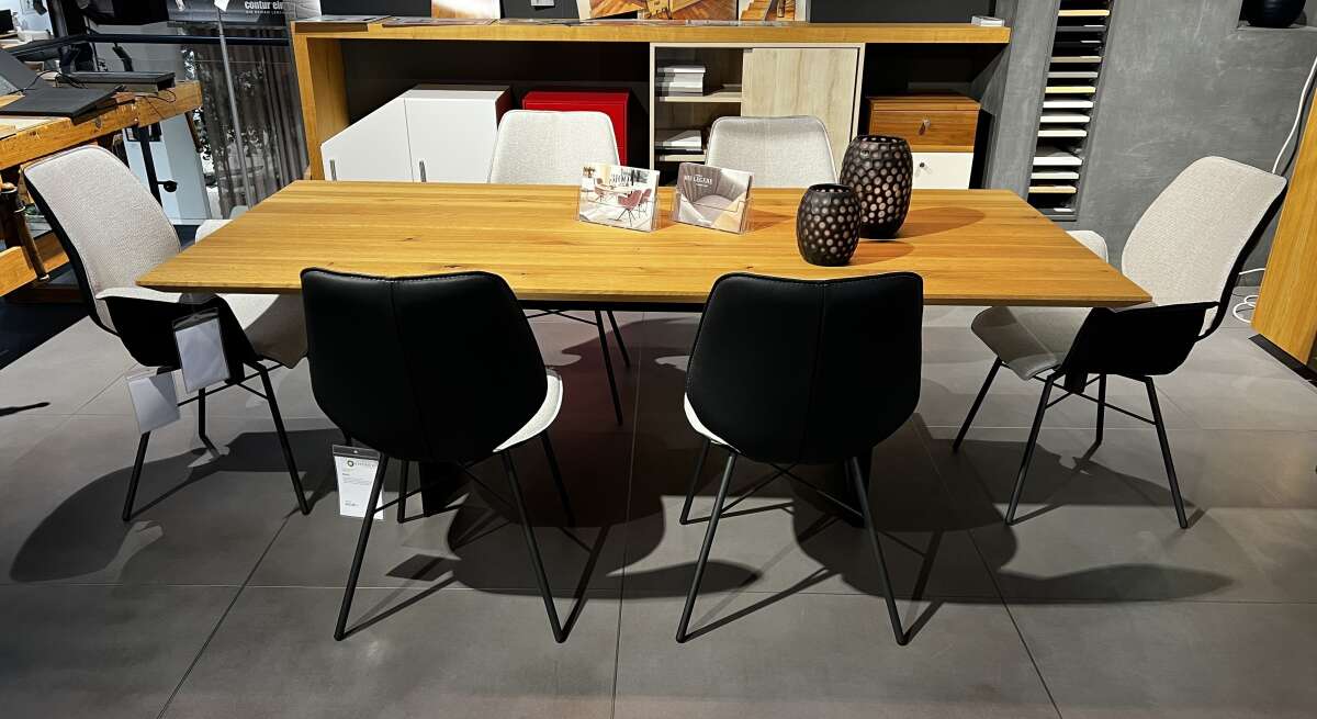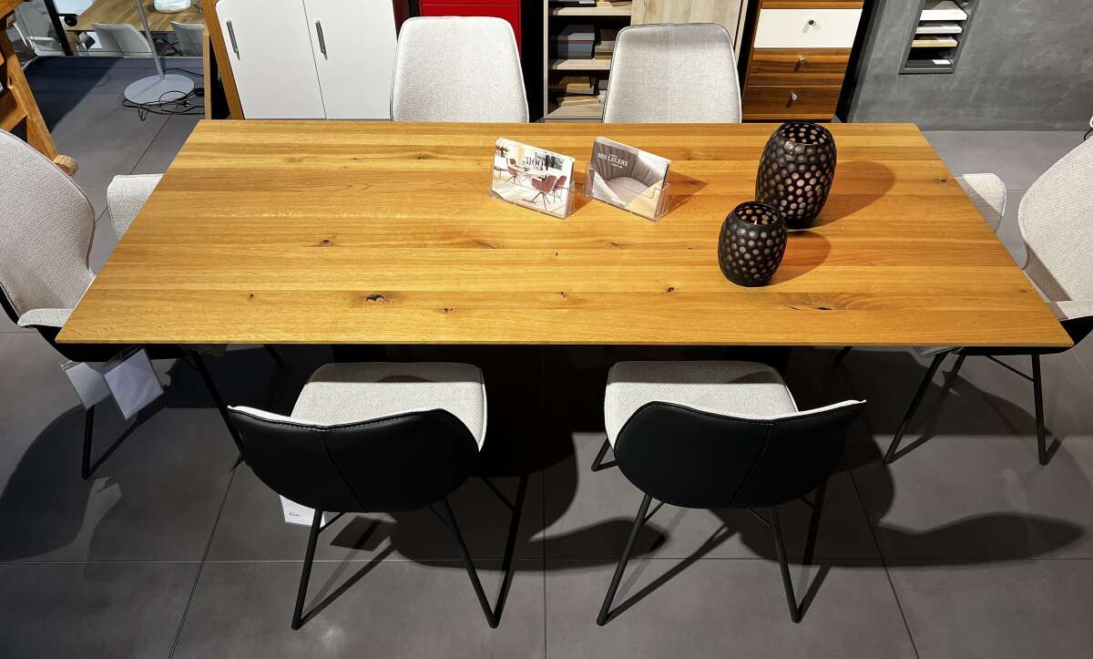 Ausführung astige Asteiche massiv geölt, schwarz pigmentiert, mit Schweizer Kante