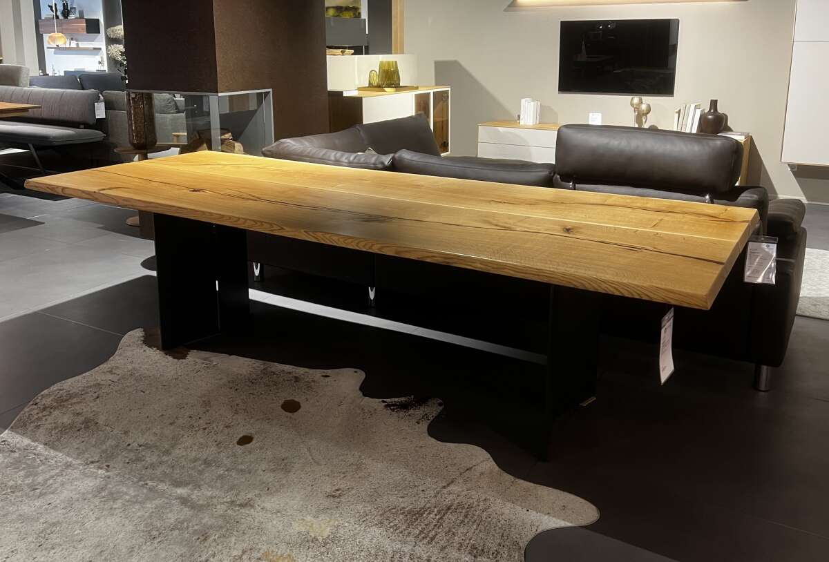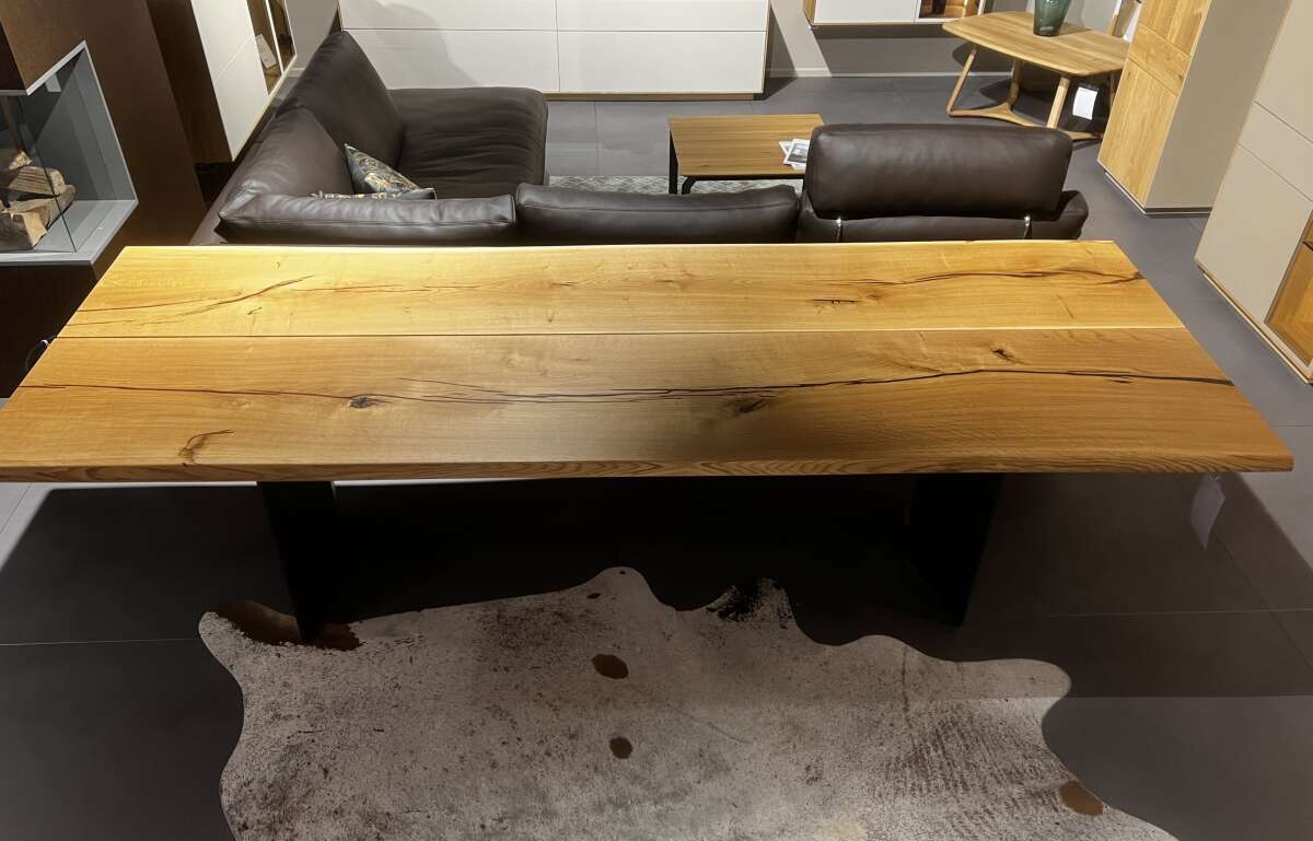 Unikat 3986, Ausführung rustikale Asteiche massiv natur geölt, Äste und Risse versiegelt, Tischplatte geteilt, mit natürlicher Baumkante