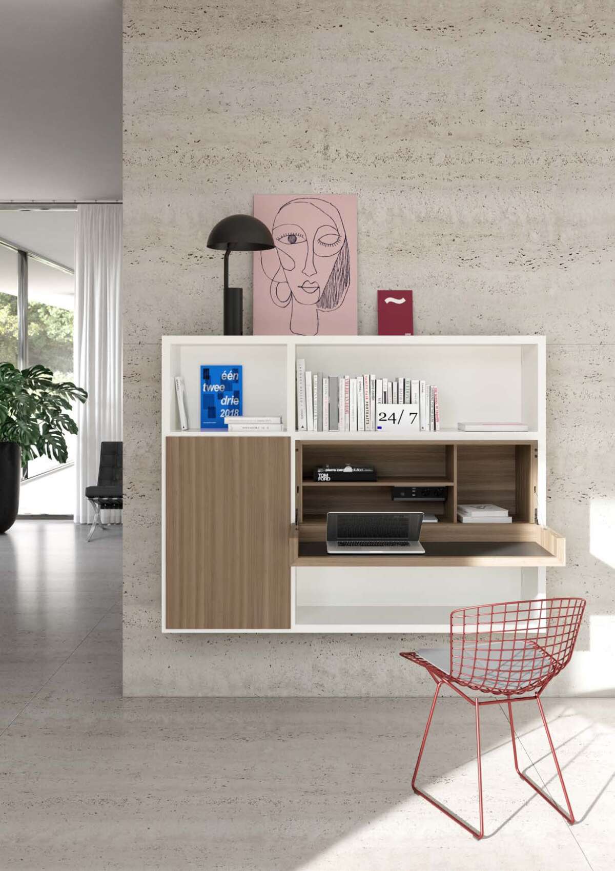 Unsere im VITA-Regal integrierte, ausklappbare Arbeitsfläche ist die ideale Lösung für alle, die nach einem kleinen Homeoffice Möbel suchen: Der moderne Sekretär bietet genügend Platz für einen Laptop und die wichtigsten Arbeitsutensilien. Das platzsparende Wandregal präsentiert mit eingebauten Fächern praktische Stauraumoptionen. Sogar Module mit Strom- und USB-Anschlüssen stehen hier optional zur Verfügung. Die Ausstattungs- und Gestaltungsvielfalt mit verschiedenen Farben und Oberflächen macht aus VITA ein ästhetisches Homeoffice Möbel, das Funktionalität und Ästhetik vereint. Ist die Arbeit erledigt, wird der Schreibtisch einfach zugeklappt.
