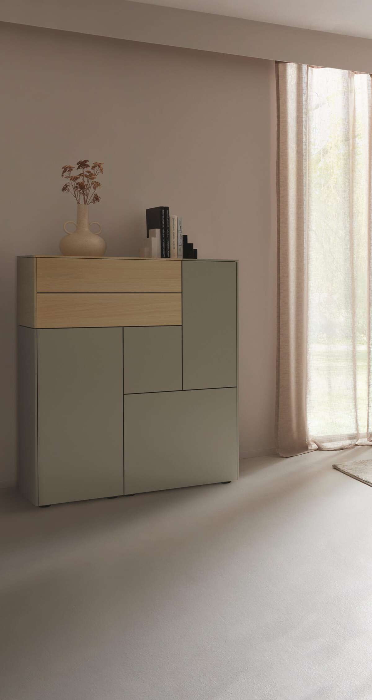 Highboard Contur® 3900 Lack, Salbei, grifflos Push-to-Open, 4 Türen, 2 Schubkästen, 3.979,–